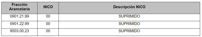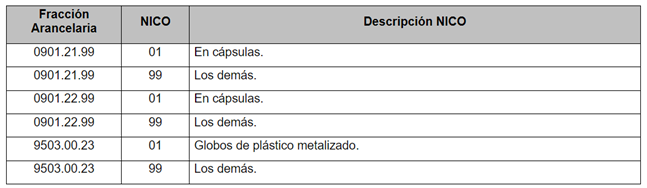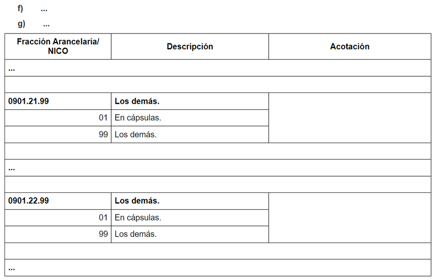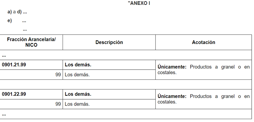 - En relación con la Modificación a NICO, se publica en DOF el día 27 de marzo de 2024 el “Acuerdo que modifica al diverso que establece las mercancías cuya importación está sujeta a regulación por parte de la Secretaría de Agricultura y Desarrollo Rural, así como la emisión del certificado de origen para la exportación de café”, en el cual se reforma el Anexo I, incisos e) y g) del Acuerdo para la F.A. 0901.21.99 y 0901.22.99, para quedar como sigue:
