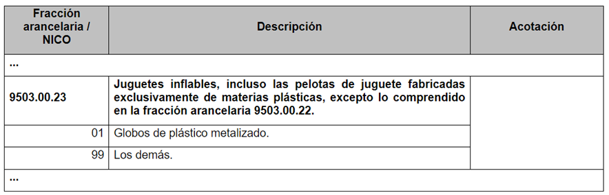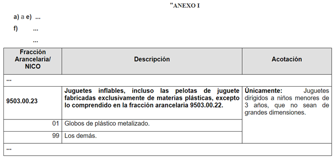 - En relación con la Modificación a NICO, se publica en DOF el día 22 de marzo de 2024 el “Acuerdo por el que se modifica el diverso por el que la Secretaría de Economía emite Reglas y Criterios de Carácter General en Materia de Comercio Exterior”, en el cual se reforma el numeral 3, fracción XI (NOM-015-SCFI-2007 – información comercial en juguetes) del Anexo de NOM para la F.A. 9503.00.23, para quedar como sigue: